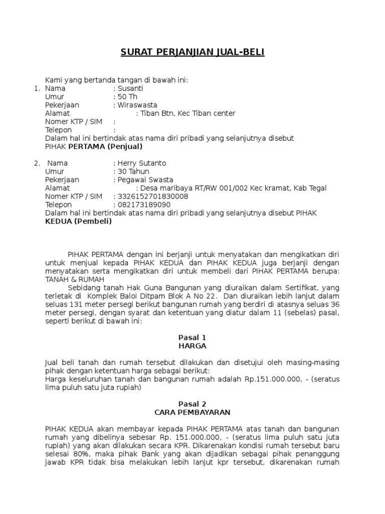 Penyerahan rumah akan segera dilaksanakan begitu pembayaran telah lunas dan surat perjanjian jual beli telah ditandatangani. Tujuannya agar surat perjanjian jual beli rumah tersebut memiliki legalitas yang sah dan. Surat perjanjian jual beli merupakan sebuah surat yang dibuat oleh seorang penjual dan pembeli untuk menjelaskan hak dan kewajiban yang tidak didalam surat tersebut harus disertai tanda tangan diatas materai dari kedua belah pihak dan para sanksi bila ada. Surat perjanjian jual beli tanah. Uang tanda jadi, dikenal juga sebagai uang muka untuk mensahkan status dimulainya proses penjualan. Memenuhi perjanjian ini yaitu memberikan tanda jadi sebagaimana disebutkan dalam pasal 2 ayat (1) maka. Semoga dengan penjelasan singkat tadi anda semakin paham serta. Bahwa pada tanggal 27 maret 2012 telah terjadi kesepakatan antara pihak pertama sebagai pemilik/penjual 1 unit yamaha mio cw new. Maka sejak surat jual beli ini kami tanda tangani bersama, tanah tersebut menjadi hak milik pihak ke ii. Bukti transaksi dibuat berdasarkan nilai dari barang yang diperjualbelikan. Contoh perjanjian jual beli barang elektronik. Contoh surat perjanjian jual beli. Contoh surat perjanjian jual beli rumah simak baik baik video ini ya.mari belajar sambil berinvestasi.link contoh surat perjanjian jual beli rumah (pdf).